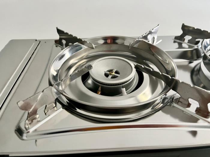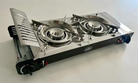 De 2 brännarna i patrongasspisen kan användas oberoende av varandra, eftersom varje använder en separat gaspatron. Spisen levereras i ett etui (dimensioner 690x325x130mm)