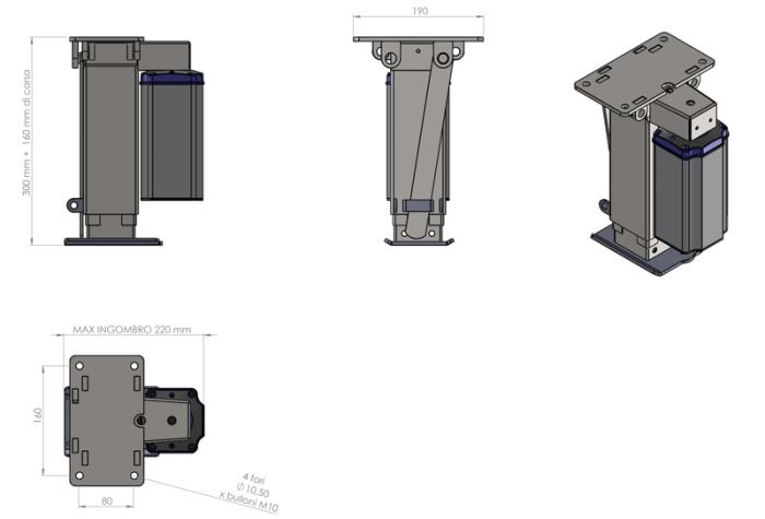 lastkapacitet pr. Søjle 2000 kg, totalbelastning 5000 kg, grundlæggende søjlængde 300 mm - kan udvides op til 420 mm, jordafstand skal garanteres. Forbrug i drift ca. 12 A.