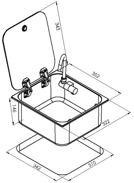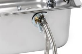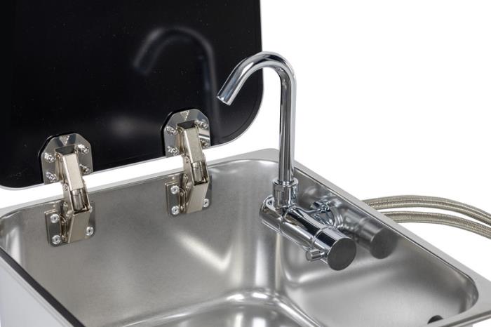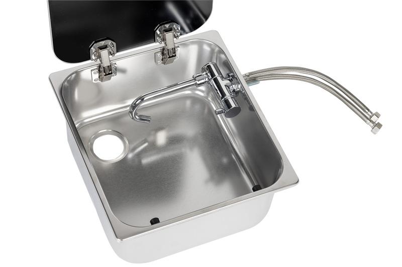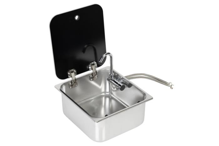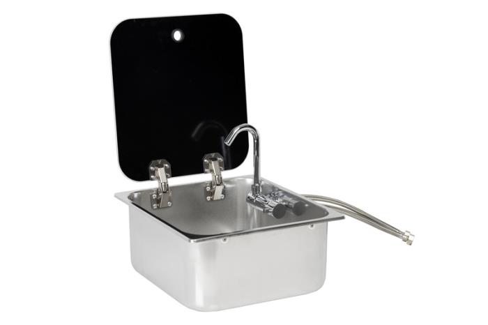 Trädgårdsdiskho med glaslock och blandare, tillverkad av rostfritt stål.