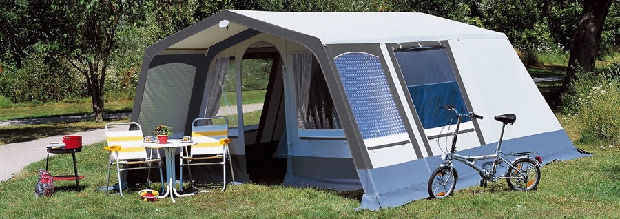 Tak av syntetmaterial med beläggning på utsidan. Väggar av trailtex-tyg med beläggning på utsidan, ljusäkta, slitstarkt och lätt. Skydds- och gräskant av polyester med beläggning på båda sidor.