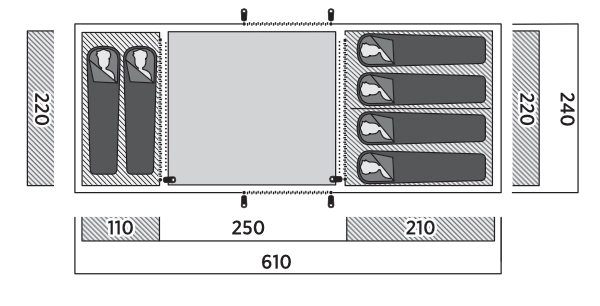 Leka Twin 6 är det perfekta valet för större familjer och kompisgäng som vill ha flexibilitet på campingresan. Tältet har en vis-a-vis design med ett rymligt vardagsrum och separata sovrum i varje ände. Fönster med infällbara gardiner på båda sidor och två ingångar säkerställer gott om ljus och enkel åtkomst. SleepTight innertältet, designat med mörkare material och optimal ventilation, säkerställer en bekväm sömn. Täckt ventilation i båda ändar möjliggör justerbart luftflöde, medan ståhöjd i vardagsrummet och praktiska bardunnhållare ökar både bekvämligheten och komforten.
