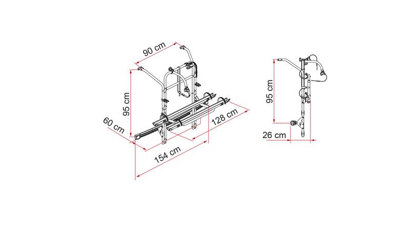 Med två skenor som standard kan upp till 4 cyklar / 2 elcyklar transporteras. Gör det möjligt att montera stödfästet i två lägen, ett standardläge och ett sänkt för att underlätta lastning av cyklarna. I nedsänkt läge är det nödvändigt att montera en nummerskyltsbärare med ljusgrupp.