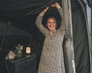 • Ljust yttertak i varma färgtoner skapar en ljus och inbjudande atmosfär i tältet