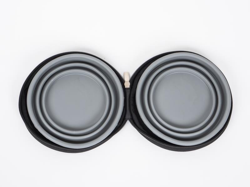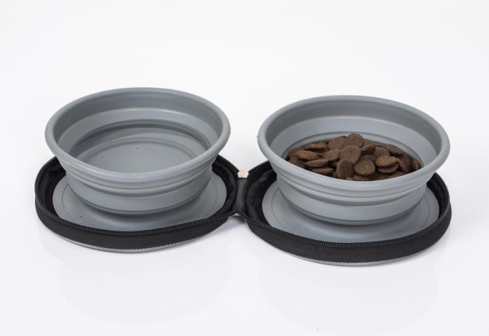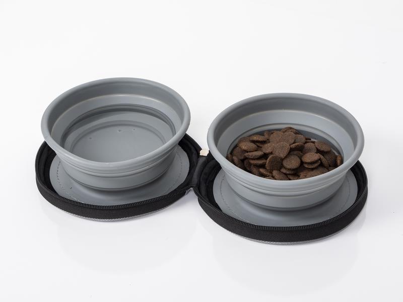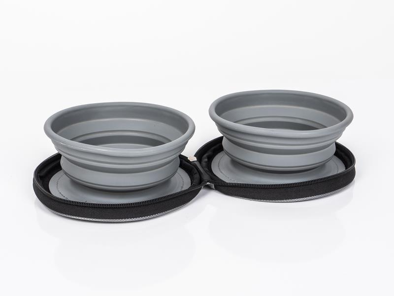 Perfekt för resan: 2 hopfällbara silikonskålar som är fästa och kan tas av i en praktisk dragkedjeficka med kardborrestängning.