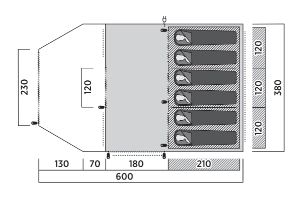 • Tältet är designat med fokus på maximal platsutnyttjande i vardagsområdet