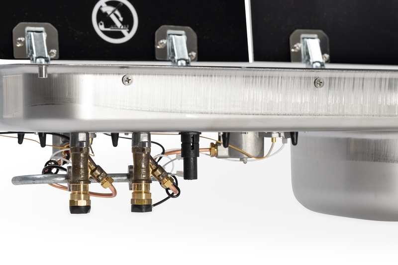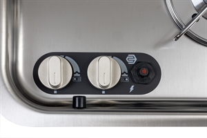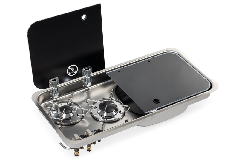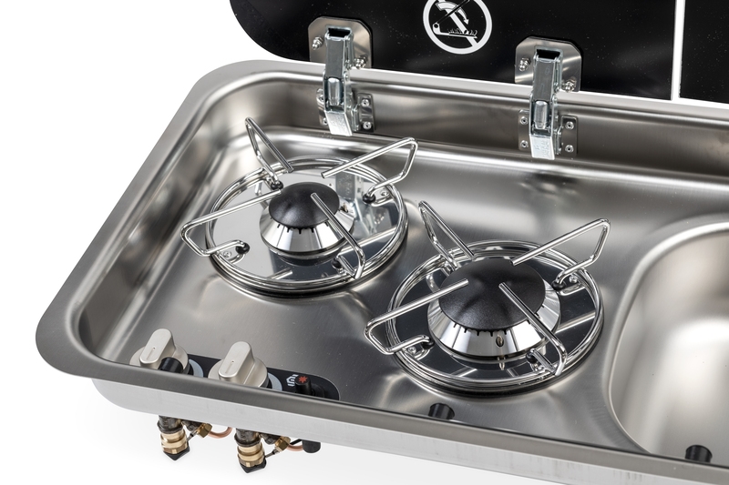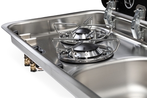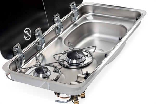 Rostfritt stål, reglagelement nedtill, 2-brännare, med piezotändning, tändsäkring och automatisk gasavstängning vid stängning av kokplattans glaslock, effekt: 1x 1,8 kW, 1x 1,0 kW, gasförbrukning 204 g/h, 30 mbar, inbyggnadsmått: B688 x D319 mm, mått: B726 x D346 x H145 mm. Håltagning för vattenkran ca. 33,5 mm (vattenkran ingår ej, rekommendation 705048). Mått diskho: B300 x D240, avloppsgarnityr: Typ E (t.ex. 705048).